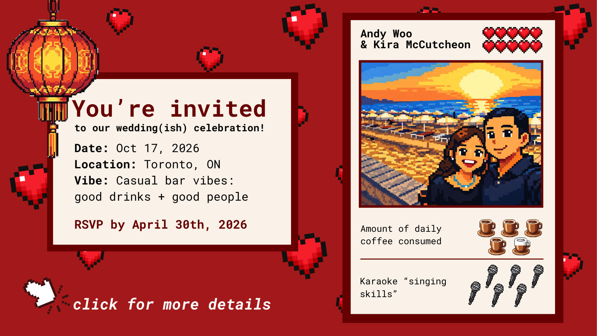 🗓️ Date: Saturday, October 17, 2026📍 Location: TBC, Toronto (we'll let you know exact location soon, but it will be in Toronto!)🎩 Dress Code: Dress code is simple - wear your nicest clothes that you still feel comfortable in.👼 The BBs: We adore kids, but this will be a grown-ups-only night. Sorry BBs!🧑🤝🧑 Extras: Please feel free to bring along a friend or a date! Just let us know in the RSVP form.🎁 This is not a wedding, just a party to celebrate with friends. If you are able to make it, your presence is our present.